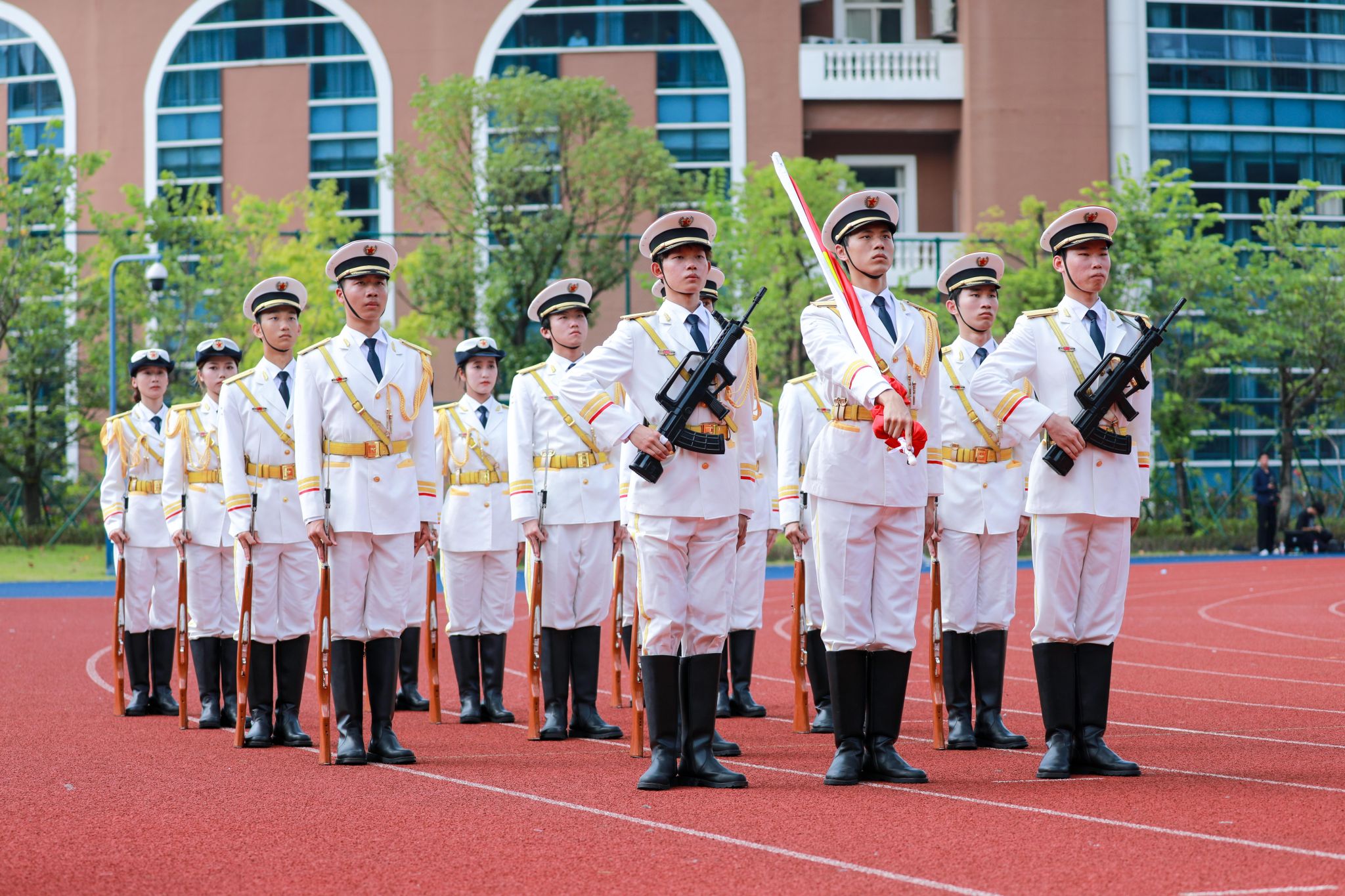 升旗仪式在新体育场举行。9月28日上午,庆祝中华人民共和国成立74周年升国旗仪式暨2022级学生军训总结表彰大会于留仙洞校区体育场顺利举办。驻香港部队深圳基地大校参谋长谢光辉,学校校长许建领,驻香港部队深圳基地上校副参谋长、军训团团长姜华出席大会。相关职能部门负责人,各二级学院分党委(总支)书记、副书记、全体带队教官和辅导员参加活动。本次大会由学生处处长王敏坚主持。9000余名2022级学生有序集结,结营仪式正...